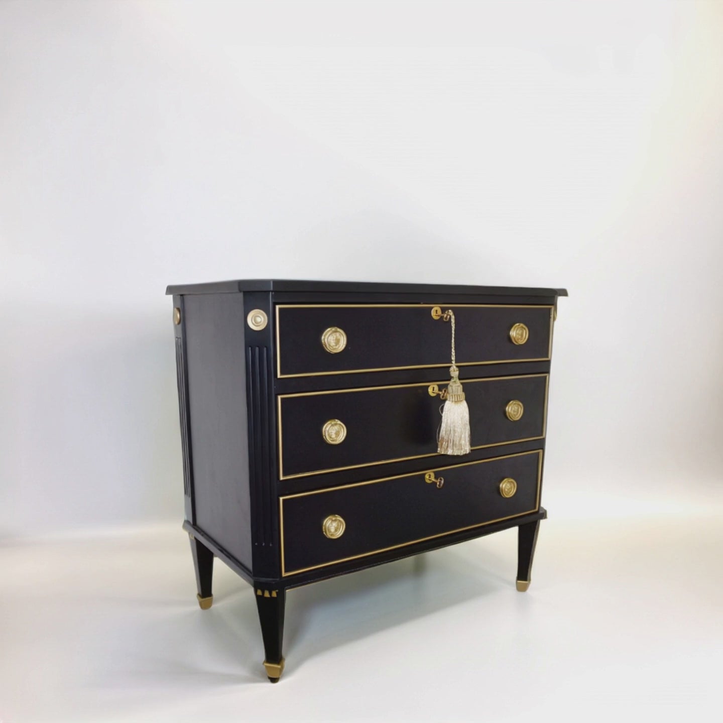 Manoir's exquisite Gustavian Dresser draws inspiration from the Gustavian style, a Swedish design movement of the 18th century featuring a pared back style influenced by French elements. The deep navy color adorned with a beautiful gold key tassel, adds a touch of sophistication and refinement that is at home equally in classic or modern interiors. Fine moldings gracefully frame the drawers, while the gold fittings lend an air of luxury. Crafted with utmost care from sustainable birch wood, this dresser features three spacious drawers for ample storage. 31.9 inches (W) x 16.9 inches (D) x 30 inches (H)